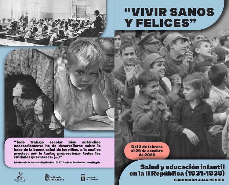 En el proyecto de la Il República de mejorar las condiciones y el bienestar de la población, la protección a la infancia tiene un papel fundamental. La idea que se persigue es extender la atención sanitaria como un derecho de toda la ciudadania, y en particular de la infancia, con una visión fundamentalmente preventiva. Por ello, entienden que la protección infantil comienza con el cuidado a la mujer embarazada, continuando con la atención durante la lactancia y la etapa escolar. Otro pilar del proceso de modernización del país será la aplicación de la renovación pedagógica y la generalización de la educación. Acercar la escuela al máximo número de personas y disminuir los altos niveles de analfabetismo, suponía, a la vez, la difusión de prácticas higiénicas en amplios sectores. La escuela y las colonias escolares, de gran desarrollo en esos años -también en Canarias, como se muestra en la exposición, serán un medio adecuado para mejorar el nivel de salud de la población infantil.